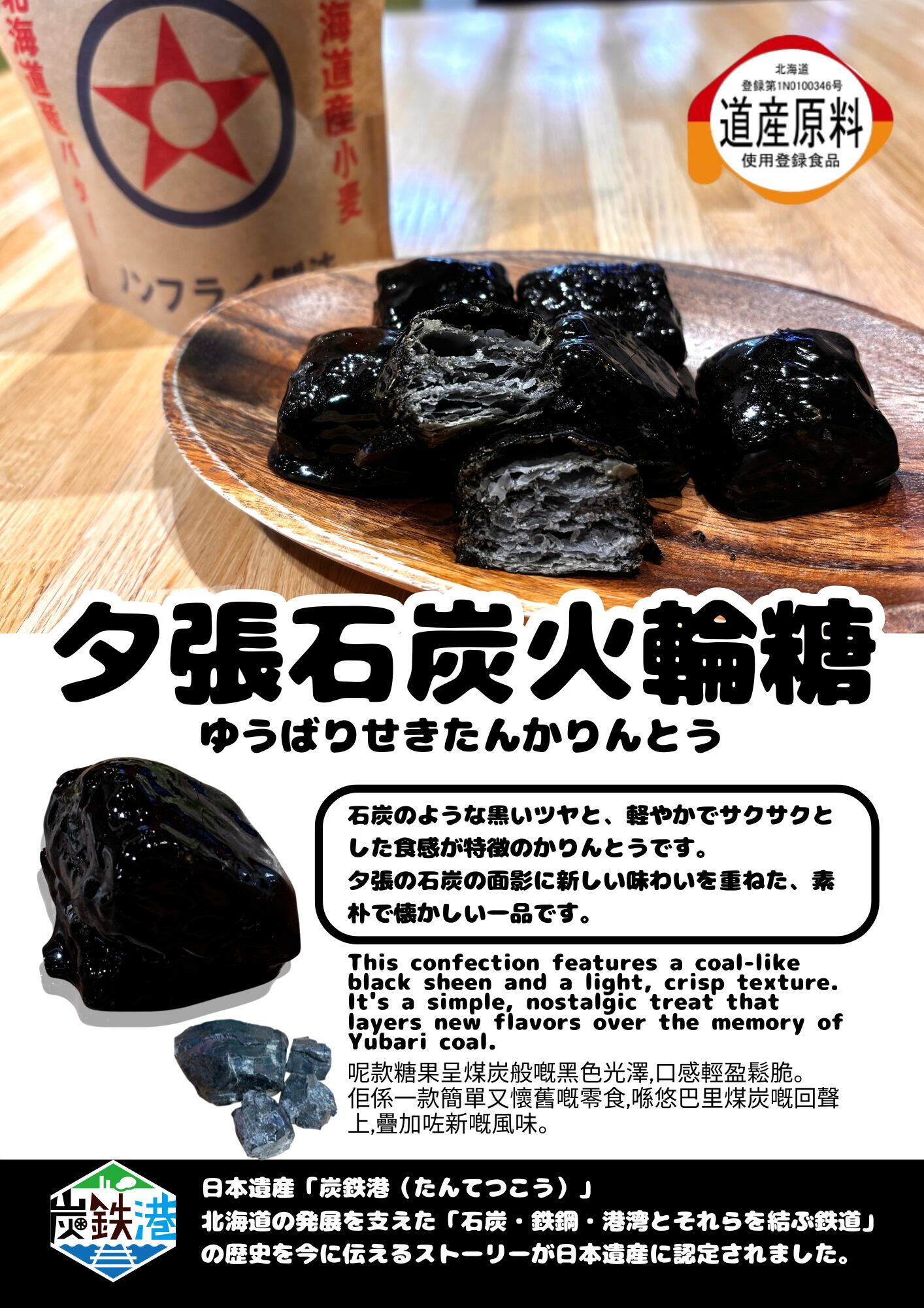 道産小麦、道産バター、そして夕張産はちみつなど原材料にもこだわり、サクサクのパイ生地に艶やかな黒糖をコーティングし、新食感のかりんとうに仕上げました!